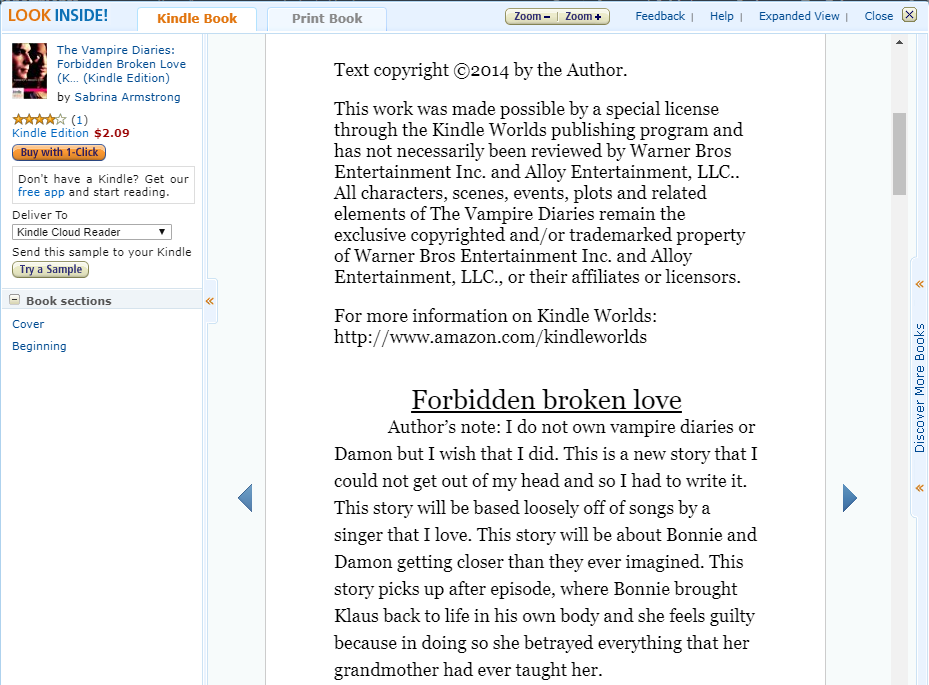 Par exemple, la fan fiction de Sabrina Armstrong, The Vampire Diaries : Forbidden Broken Love, est signalée dans le titre et entre parenthèses comme un « Kindle Worlds NovellaAccéder à la fan fiction de Sabrina Armstrong, The Vampire Diaries : Forbidden Broken Love.↩︎ ». Après la page de couverture et la mention de copyright de l’auteur se trouvent également précisées la filiation avec l’œuvre originale (à défaut de mentionner qu’il s’agit d’une fan fiction) et l’appartenance des droits sur l’univers de fiction de The Vampire DiariesThe Vampire Diaries est une série de livres fantastiques pour la jeunesse dont les premiers tomes, paru en 1991-1992 ont été écrits par Lisa Jane Smith. Les romans racontent les aventures d’une adolescente dont la vie va être bouleversée par la rencontre avec un séduisant vampire. Les livres ont fait l’objet depuis 2009 d’une adaptation sous forme de série télévisée qui a obtenu un succès considérable. En savoir plus.↩︎ à la Warner Bros.