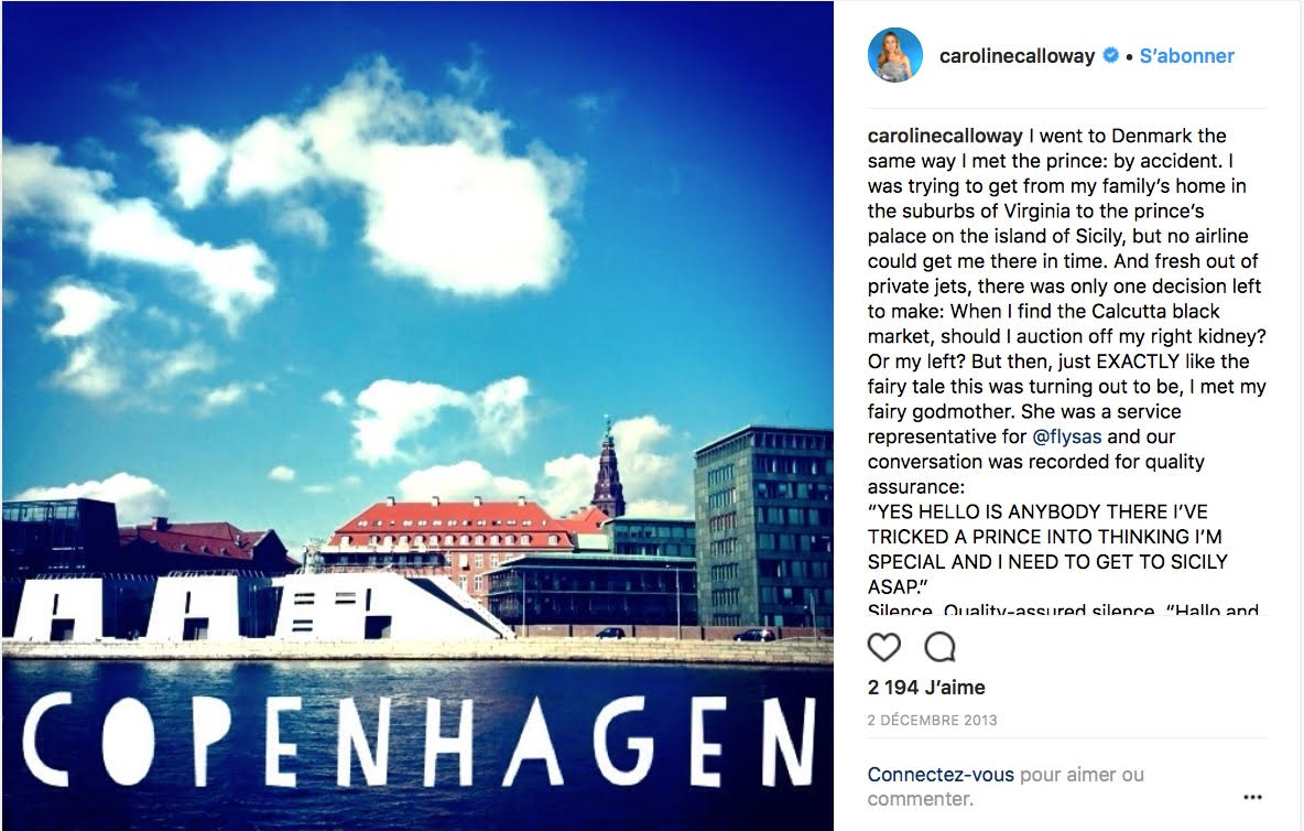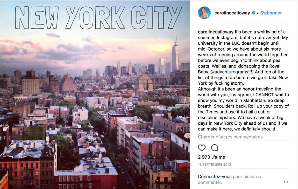 Caroline Calloway est une Américaine d’une vingtaine d’années qui publie le récit de ses aventures sur les réseaux sociaux depuis juin 2012. Son lectorat a dépassé petit à petit le cercle de ses relations pour atteindre aujourd’hui plus de 608 000 abonnés sur InstagramConsulter le compte Instagram de Caroline Calloway.↩︎ – son réseau de prédilection, 53 600 sur TwitterAccéder au compte Twitter de Caroline Calloway.↩︎ et 50 700 sur FacebookConsulter la page Facebook de Caroline Calloway.↩︎Chiffres en date d’octobre 2016.↩︎. Cette étudiante en histoire de l’art relate son expérience en Angleterre à l’Université de Cambridge. Il s’agit pour elle de raconter « l’histoire de sa vie », celle d’une jeune Américaine face aux déboires universitaires, aux rencontres amicales festives et aux tumultes amoureux propres à ce moment de bascule vers l’âge adulte. Sous le hashtag « #adventuregrams », Calloway documente donc sa vie. Son approche médiatique est hybride : chacun de ses messages sur Instagram est constitué d’une image et d’un texte qui, s’il reste court, atteint tout de même souvent la limite de caractères imposée par le site. Photographies d’elle-même, de ses amis, paysages des lieux qu’elle a visités, de ses repas : ses images comme ses textes dépeignent une vie qui semble avant tout tenir du conte de fées. À ce titre, son petit ami Oscar, jeune et séduisant étudiant suédois, fait indubitablement figure de prince charmant…