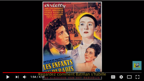 Les affiches sont associées à une bande sonore qui se révèle le fil d’Ariane du savant découpage : les affiches à peine modifiées de BambiVoir l’affiche de Bambi telle qu’utilisée dans l’épisode.↩︎ (1942), Ex DrummerVoir l’affiche de Ex Drummer telle qu’utilisée dans l’épisode.↩︎ (2007), The GooniesVoir l’affiche de The Goonies telle qu’utilisée dans l’épisode.↩︎ (1985) ou BrazilVoir l’affiche de Brazil telle qu’utilisée dans l’épisode.↩︎ (1985) s’animent progressivement, en phase avec l’action créée. Ces animations préservent l’essentiel des affiches et se limitent à faire bouger lèvres, les regards ou les poses des personnages. Par exemple, l’affiche coréenne de Dirty DancingVoir l’affiche de Dirty Dancing telle qu’utilisée dans l’épisode.↩︎ (1987) montre le couple de danseurs enlacés, sauf que la main du personnage masculin passe de la taille au sein droit de sa partenaire. L’intrigue du conte s’établit alors que s’anime l’affiche du film Les enfants du paradis (1945) pendant que la bande-son compose un dialogue original mettant en vedette Batman, incarné par le mime Deburau. Ainsi, ce mime travesti sur le plan sonore entame un dialogue avec les deux autres personnages de l’affiche qui, eux, prennent à témoin les personnages d’affiches d’autres films, comme s’il existait une communauté d’affiches cinématographiques accrochées quelque part, en relation entre elles. Quand il reconnaît Batman, Lemaître s’exclame dans un anglais à l’accent français « Hé les mecs ! Regardez comment Batman s’habille sous son costume » (sous-titres français de la capsule).