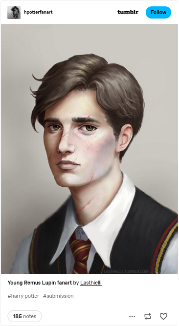 Ainsi, les fan fictions sont des productions hybrides créées à partir d’une œuvre originale. La lecture effectuée par le fan aboutit à la production de ce que Jenkins appelle du « meta-text » : soit des textes, des vidéos ou des dessins qu’il réalise sur les thèmes des œuvres qu’il s’approprie et qui sont diffusés par les médias sociaux, blogues et autres plateformes web. Ainsi, on peut trouver autour de l’univers de Harry PotterHarry Potter est une série littéraire de fantasy écrite entre 1997 et 2007 par l’auteure britannique J. K. Rowling. Elle raconte le passage à l’âge adulte d’un jeune sorcier orphelin. En savoir plus.↩︎ des tumblr. de fan artVoir par exemple le tumblr. Harry Potter Fanart.↩︎, où les amateurs publient leurs propres illustrations des aventures du magicien à lunettes.