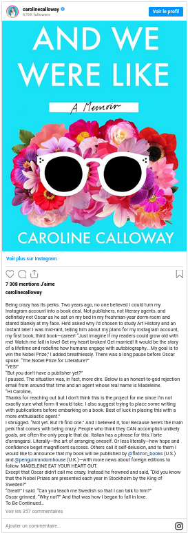 Pour le chercheur Philippe Lejeune, l’autobiographie est un « récit rétrospectif en prose qu’une personne réelle fait de sa propre existence lorsqu’elle met l’accent sur sa vie individuelle, en particulier, sur l’histoire de sa personnalité » (1975, 14). Et c’est bien à un tel travail que se livre la jeune femme, même son récit paraît souvent empreint d’une certaine préciosité qui se manifeste par exemple dans des tournures au passé simple – les réseaux sociaux favorisent une écriture au présent – ou dans l’affectation de ses dialogues, un format loin d’être usuel sur Instagram, ou encore dans sa gestion de la temporalité. En effet, Calloway effectue parfois des prolepses, anticipant sur des événements à venir (« Oscar me dira plus tard qu’il est tombé amoureux de moi la première fois qu’il m’a vue dans ma combinaison-pyjamaVoir une publication Instagram de Calloway illustrant son usage de la prolepse.↩︎ »).
