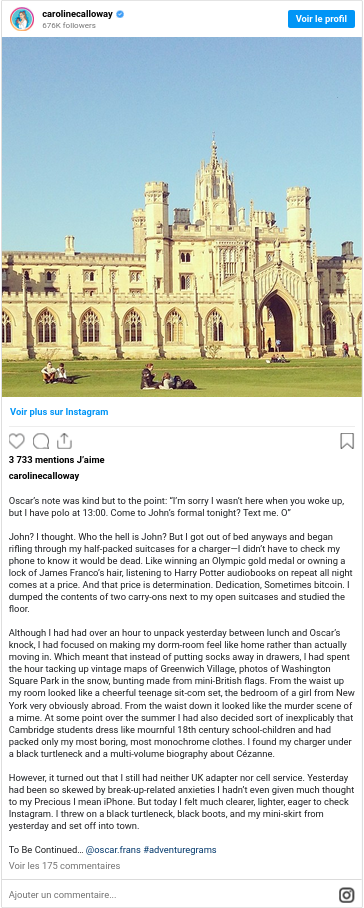 Caroline Calloway est une Américaine d’une vingtaine d’années qui publie le récit de ses aventures sur les réseaux sociaux depuis juin 2012. Son lectorat a dépassé petit à petit le cercle de ses relations pour atteindre aujourd’hui plus de 608 000 abonnés sur InstagramConsulter le compte Instagram de Caroline Calloway.↩︎ – son réseau de prédilection, 53 600 sur TwitterAccéder au compte Twitter de Caroline Calloway.↩︎ et 50 700 sur FacebookConsulter la page Facebook de Caroline Calloway.↩︎Chiffres en date d’octobre 2016.↩︎. Cette étudiante en histoire de l’art relate son expérience en Angleterre à l’Université de Cambridge. Il s’agit pour elle de raconter « l’histoire de sa vie », celle d’une jeune Américaine face aux déboires universitaires, aux rencontres amicales festives et aux tumultes amoureux propres à ce moment de bascule vers l’âge adulte. Sous le hashtag « #adventuregrams », Calloway documente donc sa vie. Son approche médiatique est hybride : chacun de ses messages sur Instagram est constitué d’une image et d’un texte qui, s’il reste court, atteint tout de même souvent la limite de caractères imposée par le site. Photographies d’elle-même, de ses amis, paysages des lieux qu’elle a visités, de ses repas : ses images comme ses textes dépeignent une vie qui semble avant tout tenir du conte de fées. À ce titre, son petit ami Oscar, jeune et séduisant étudiant suédois, fait indubitablement figure de prince charmant…